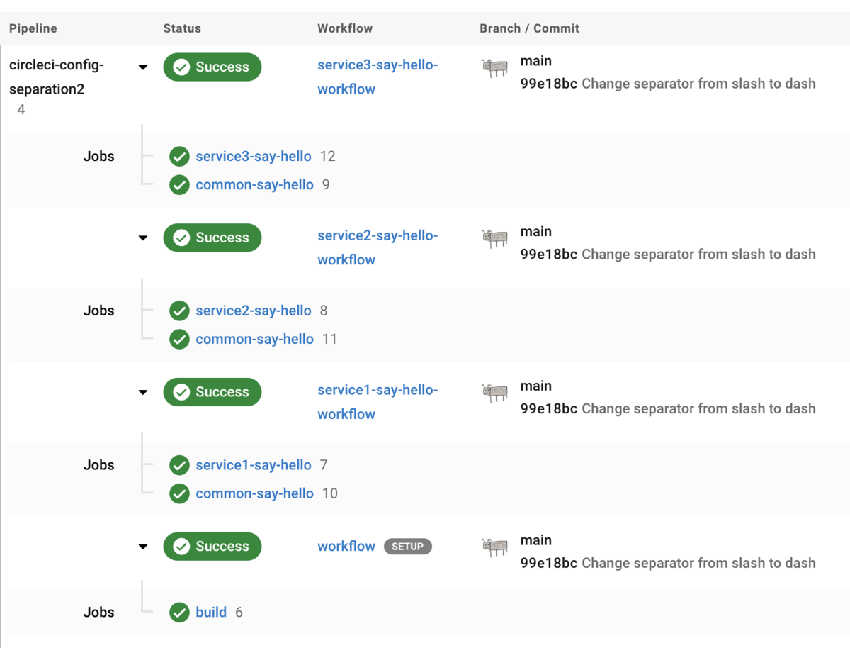 最終的にはひとつの YAML ファイルにまとめてしまうので、各サービスのジョブやワークフローの名前がかぶらないようにしないといけないのだ