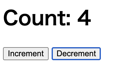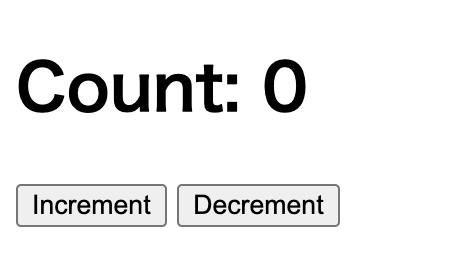 <body> <h1> Count: <span id='count'>{count}</span> </h1> <button hx-post='/api/increment' hx-target='#count'> Increment </button> <button hx-post='/api/decrement' hx-target='#count'> Decrement </button> </body>