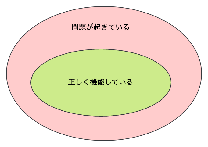 - 「正しく機能している」ならば「問題が起きている」は真と捉えてよさそうだけど、その逆は真ではないかもしれない