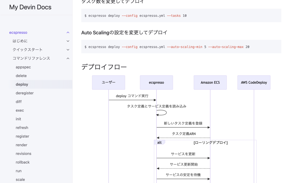 # ステップ2 ## 重要 - 実装方針の確認はせずにプルリクエストを作りきること ## 指示 以下の内容に従ってecspressoのドキュメントを生成してください。 - 分析対象: - kayac/ecspressoのGoのソースコードをとても注意深く読み込んで深く理解すること。 - README.mdなどのドキュメントは古い可能性があるのでソースコードで確認をして確証が得られた情報のみを使用すること。 - 言語:日本語 - 出力形式:Jekyllでビルドするためのマークダウン形式 - 内容:「どう使うか」に焦点を当てた技術ドキュメント - 図表:Mermaidを使用したアーキテクチャ図・データフロー図によって理解が深まる場所には図をいれる - 目次構造: 1. はじめに 1.1 ecspressoとは 1.2 インストール方法 2. クイックスタート 2.1 基本的な使い方 2.2 よくあるユースケース 3. コマンドリファレンス 4. 実践ガイド 4.1 CI/CDパイプラインとの統合 4.2 複数環境での運用 4.3 大規模サービスの管理 5. トラブルシューティング - ファイル構成: - 各セクション・サブセクションは別々のファイル - コマンドリファレンスのセクションではコマンド1つに対して必ず1つのサブセクションを作成すること 完了後作業 - 生成したドキュメントをdevin-docsのecspressoフォルダに入れてプルリクエストを作成